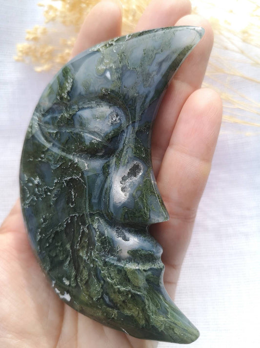 Large moss agate half moon face carving with druzy