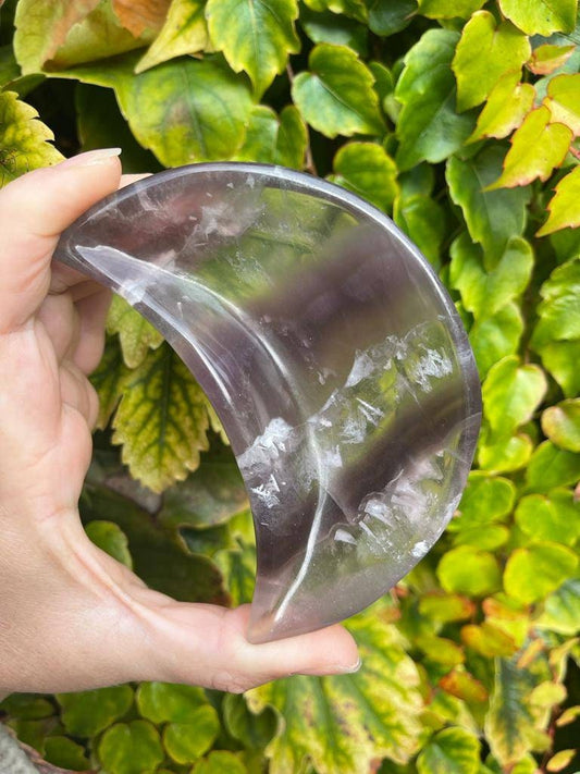Beautiful purple fluorite moon bowl carving. 105mm long