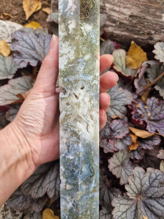 Beautiful moss agate half moon carving with druzy 205g 22cm
