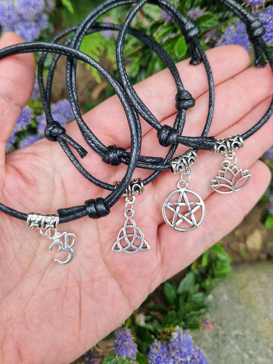 Adjustable Cord anklet. Ohm, Pentagram, Trinity knot, Peace, Lotus flower, Mushroom and more
