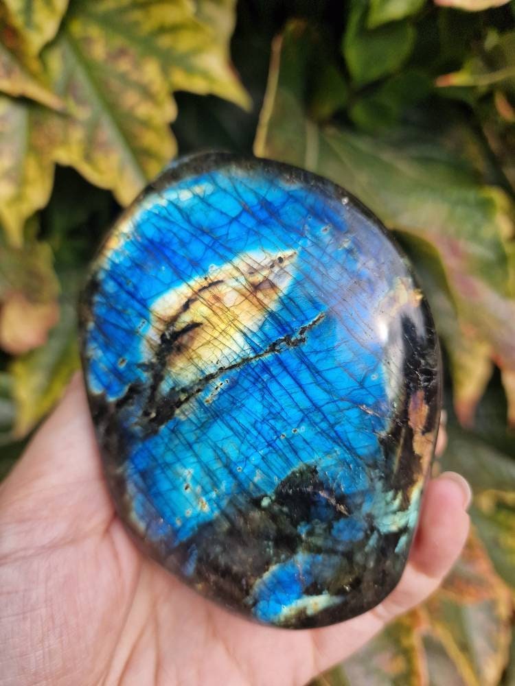 Beautiful blue green and yellow flash labradorite freeform 452g. Large statement Labradorite free form.
