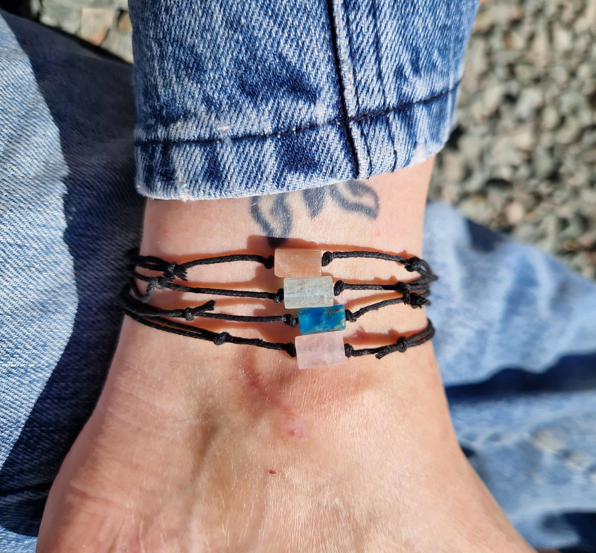 Beautiful crystal anklet. Apatite. Sunstone. Aquamarine. Rose quartz anklet. Adjustable cord.