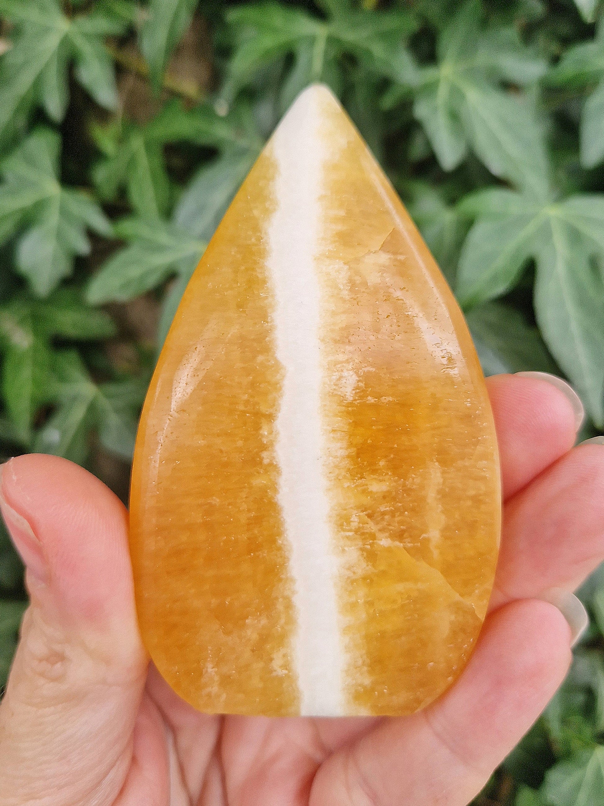 beautiful high grade orange calcite crystal flame freeform leaf. banded orange calcite premium quality. dark orange