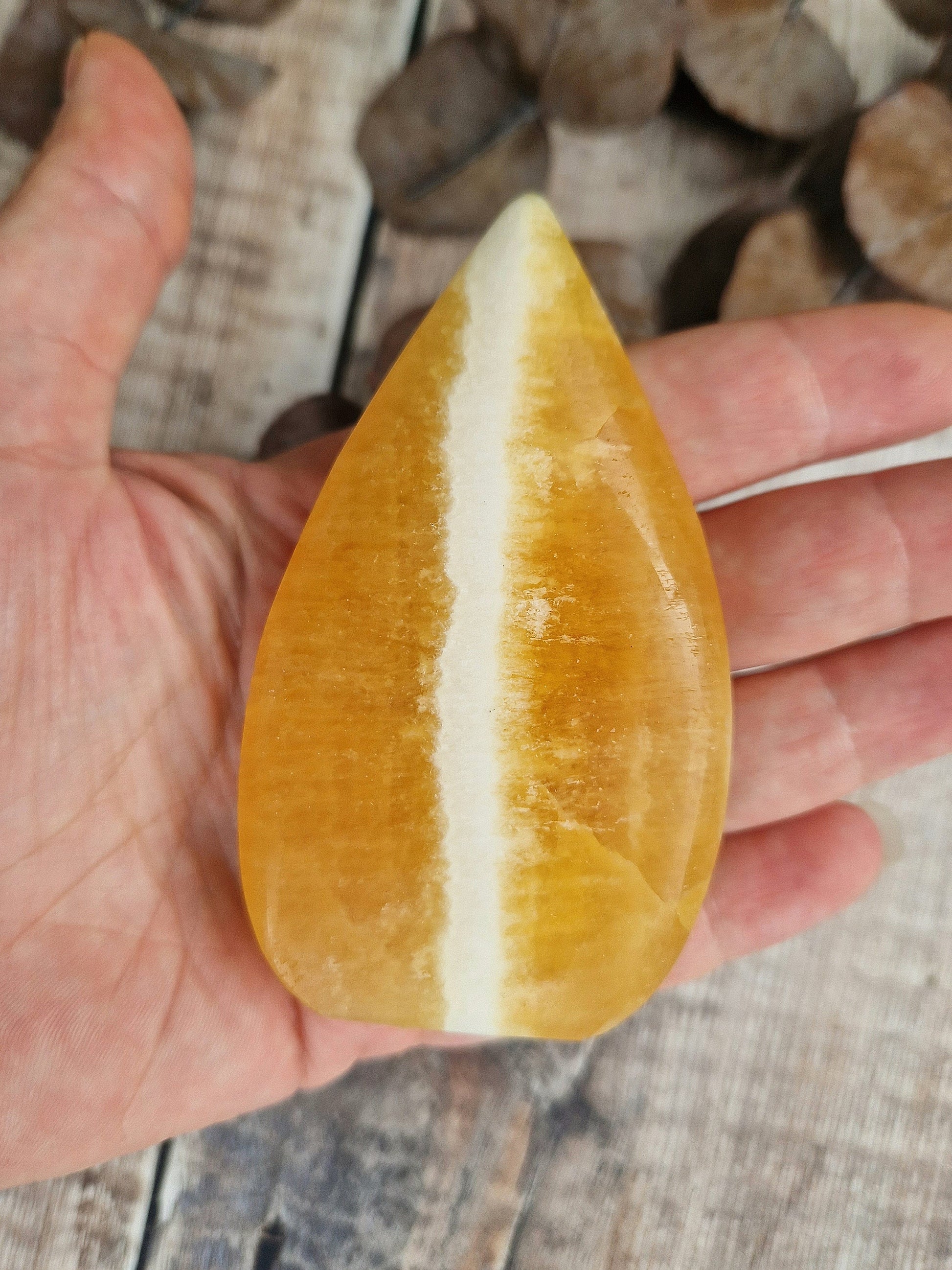 This banded orange calcite measures 9cm. You will recieve the crystal that is photographed.