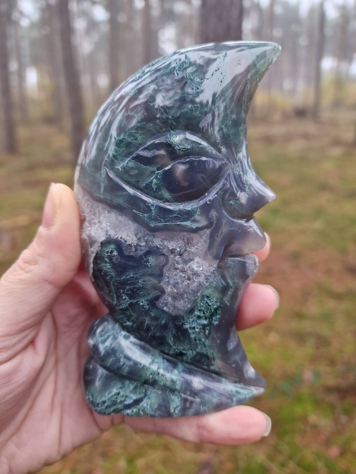 Beautiful moss agate standing moon carving. Moss agate moon. Blue / dark moss agate