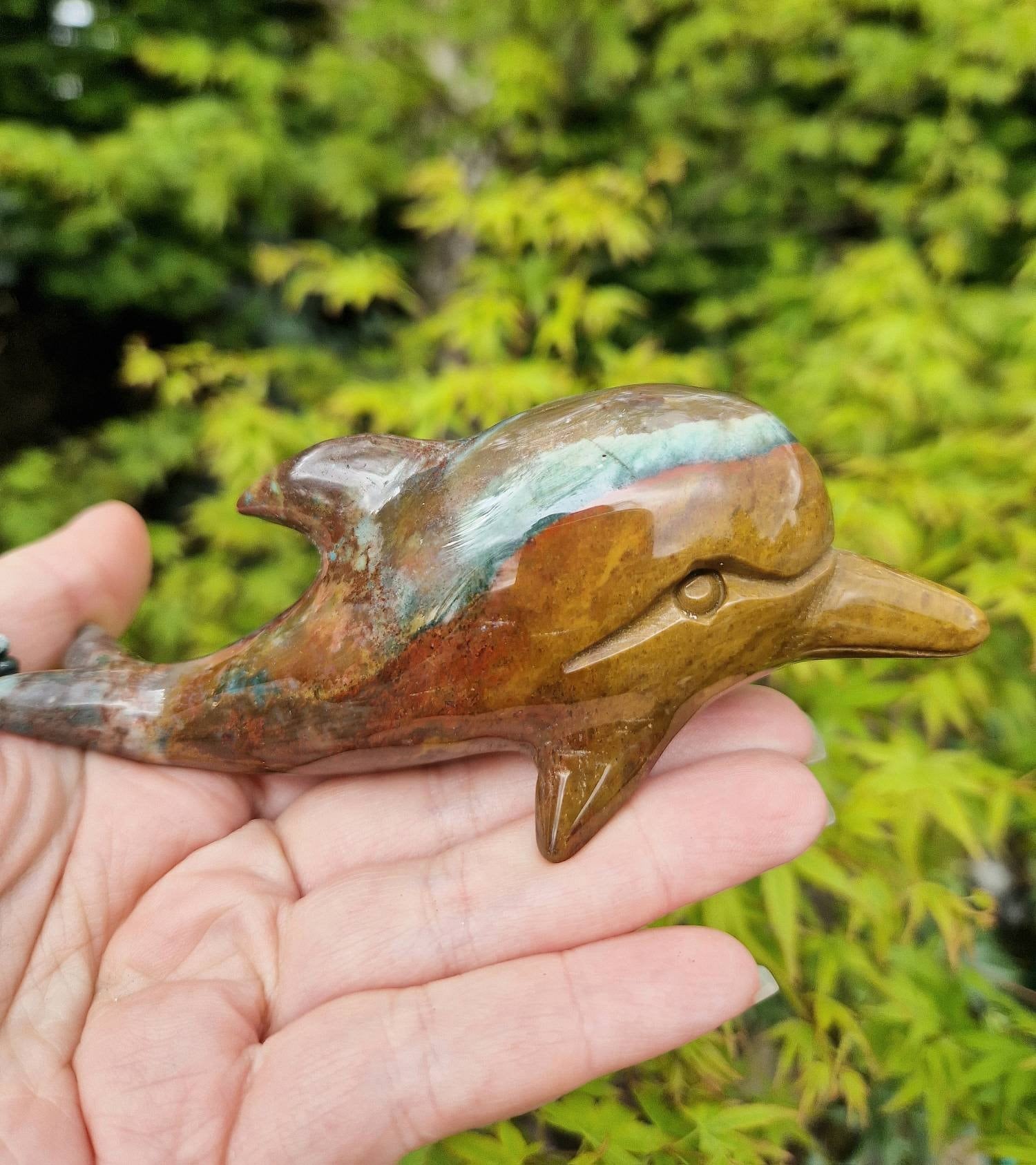 Beautiful ocean jasper dolphin. Statement crystal carving. Premium quality. Dolphin crystal. Large ocean jasper carving