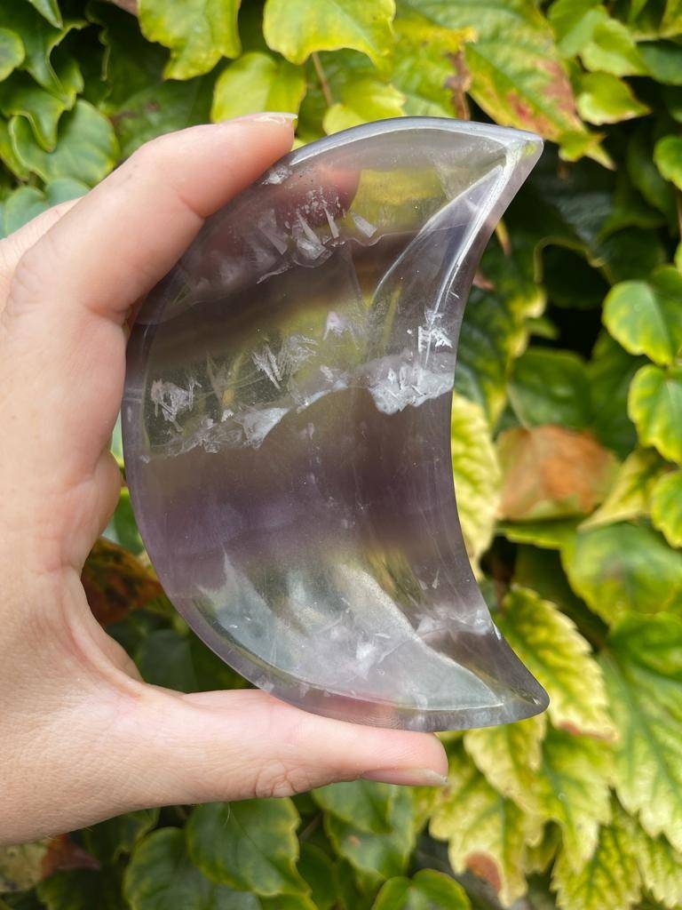 Beautiful purple fluorite moon bowl carving. 105mm long