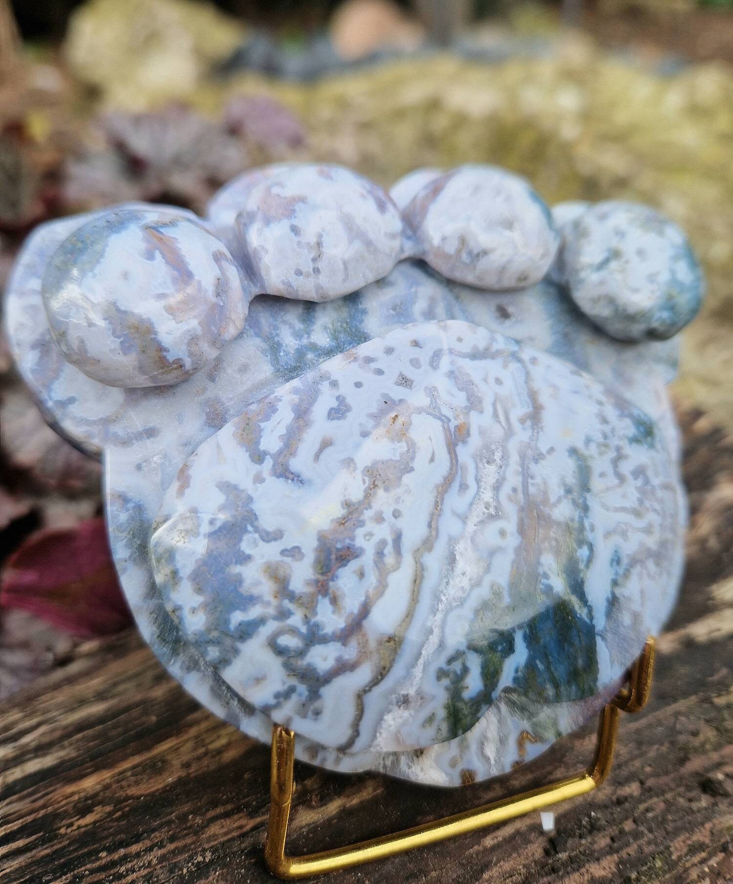 Beautiful statement moss agate paw print carving 350g