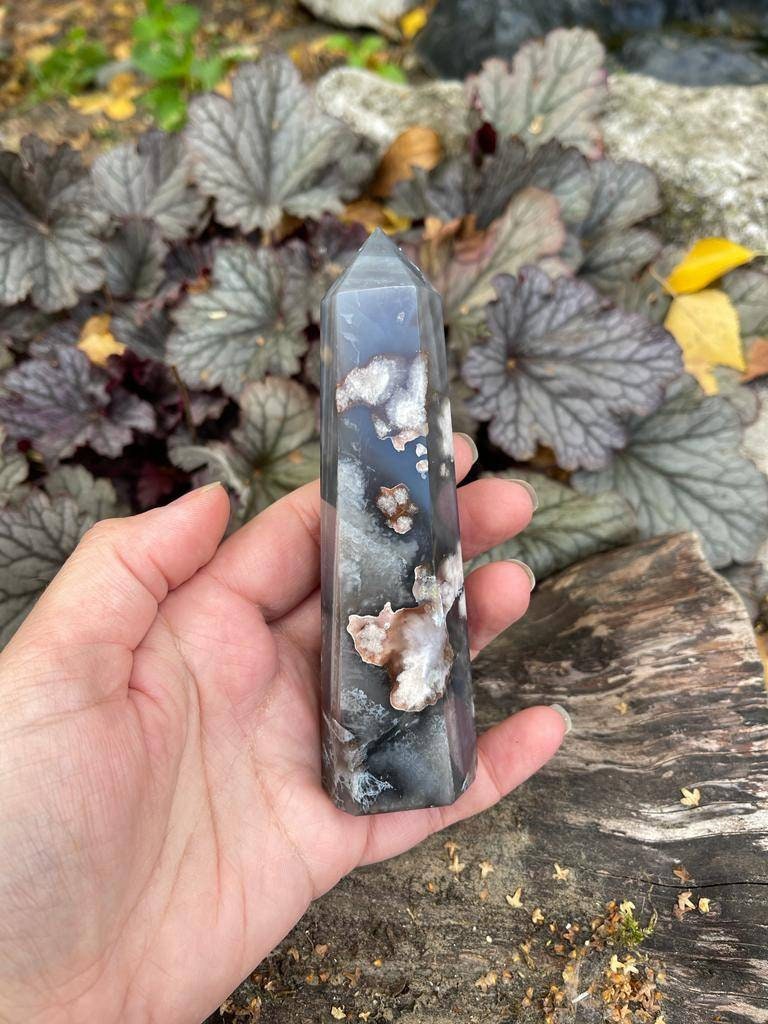 AAA grade premium quality genuine Black flower agate tower from Madagascar. 190g 125mm