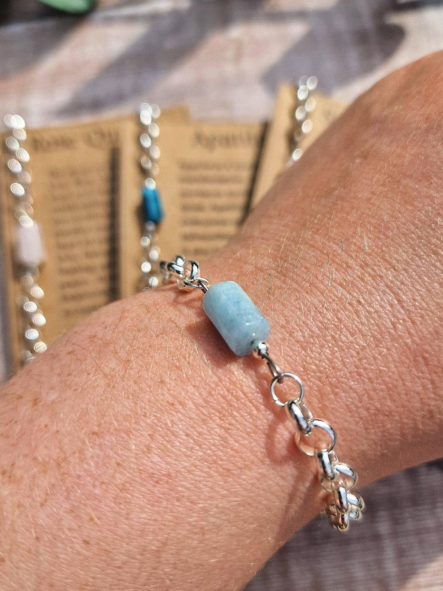 Crystal bracelet on a chunky silver chain. Apatite, aquamarine, Rose quartz, Sunstone gemstone bracelet on Descriptive Card