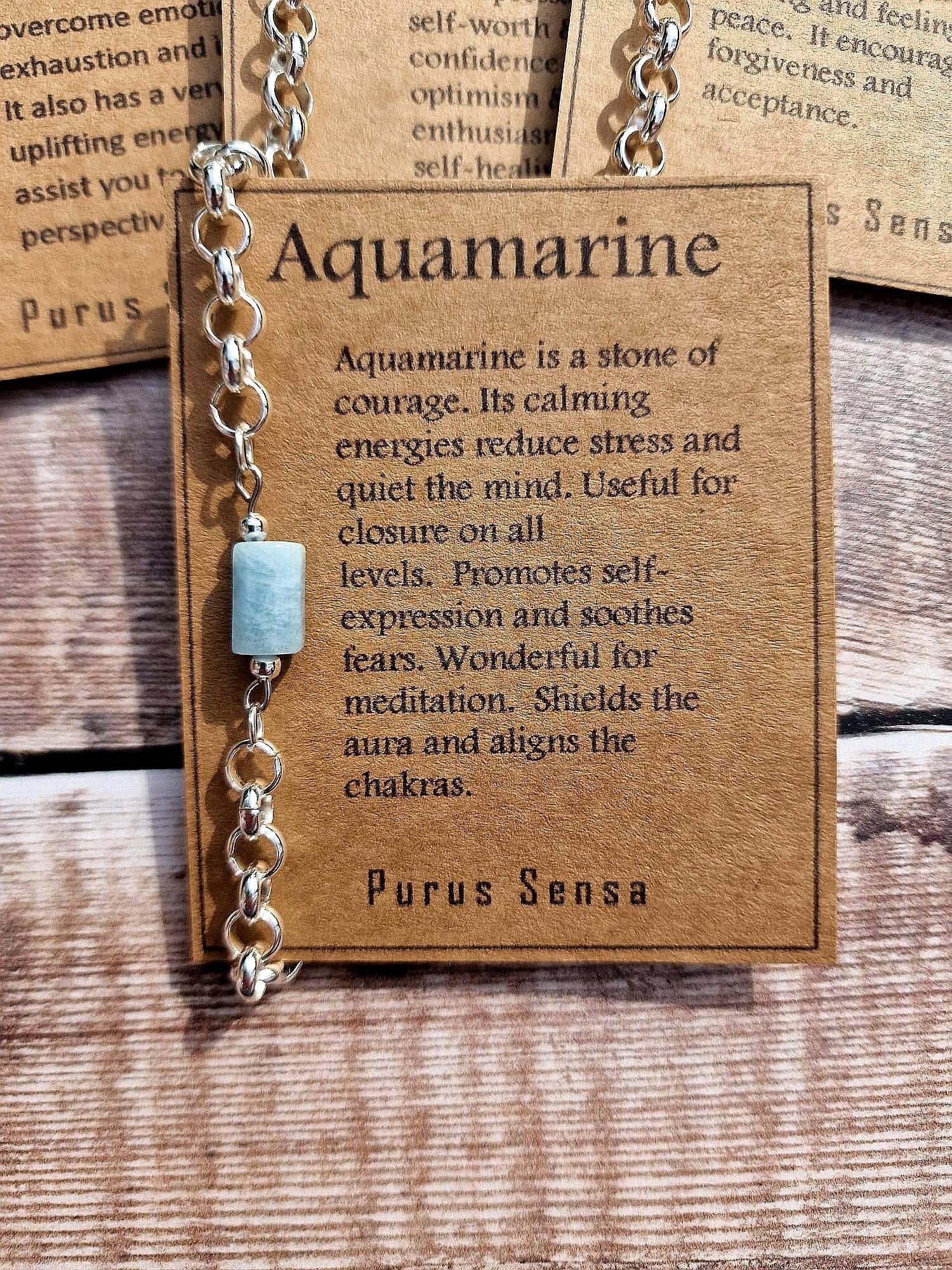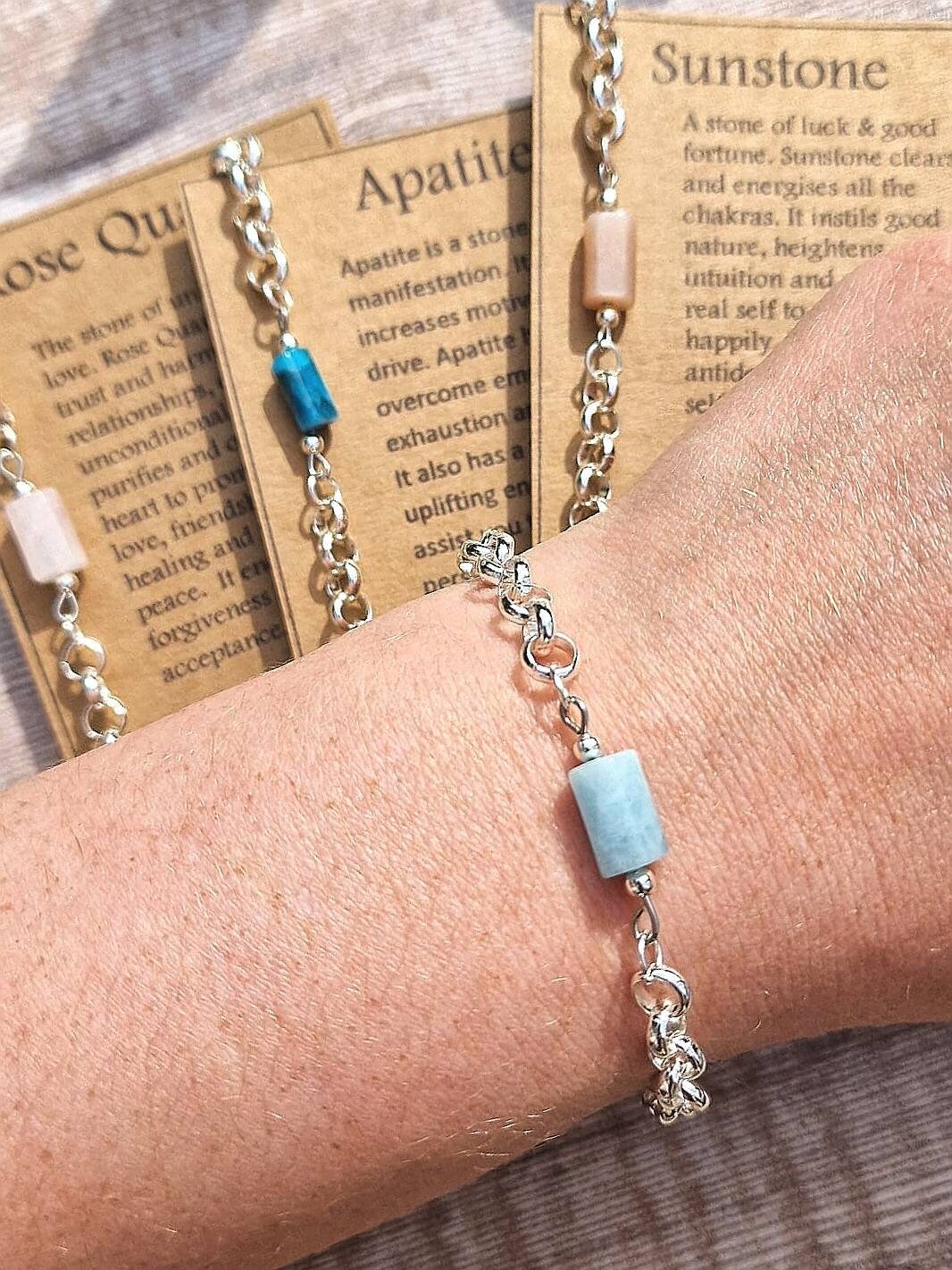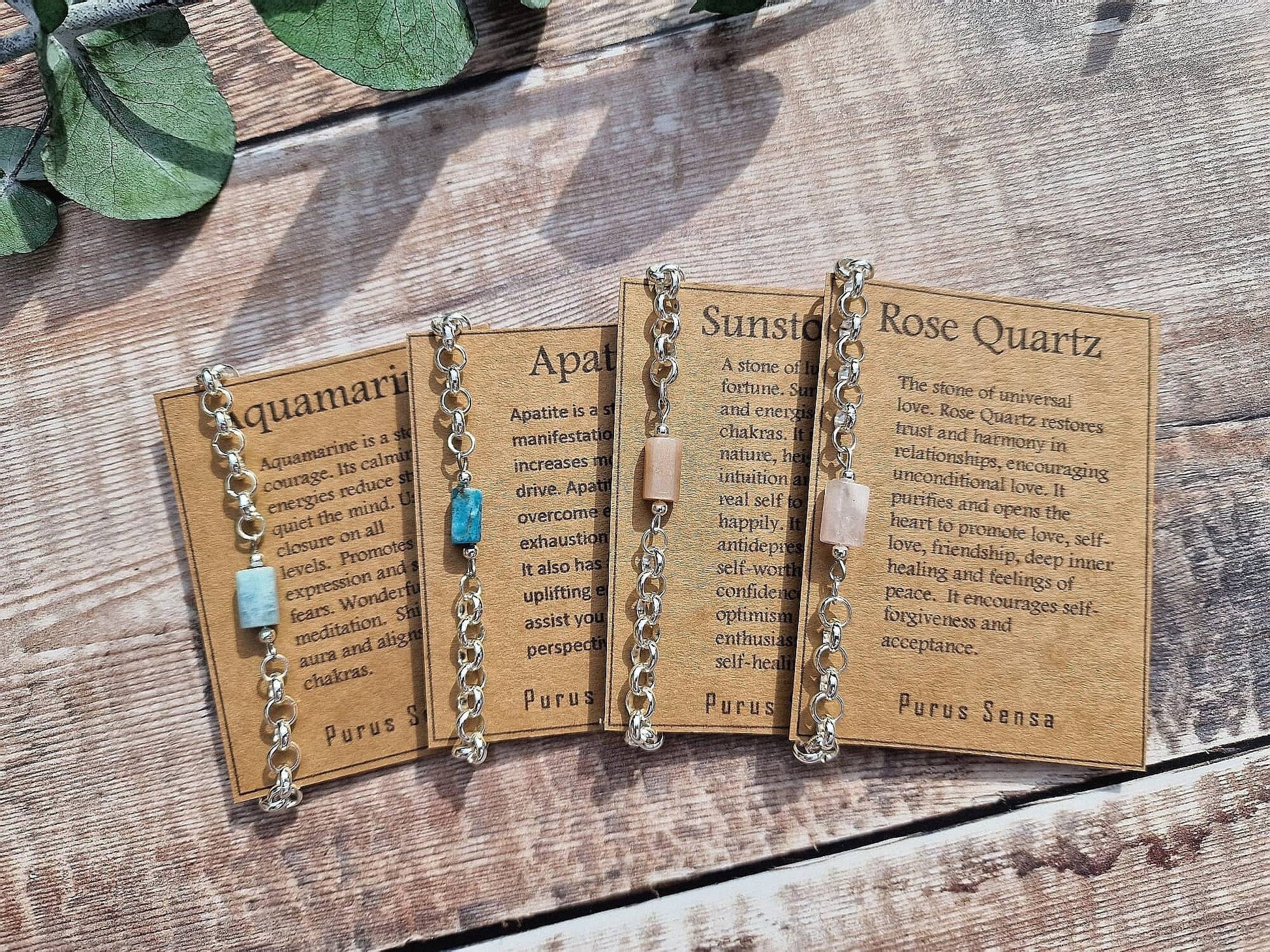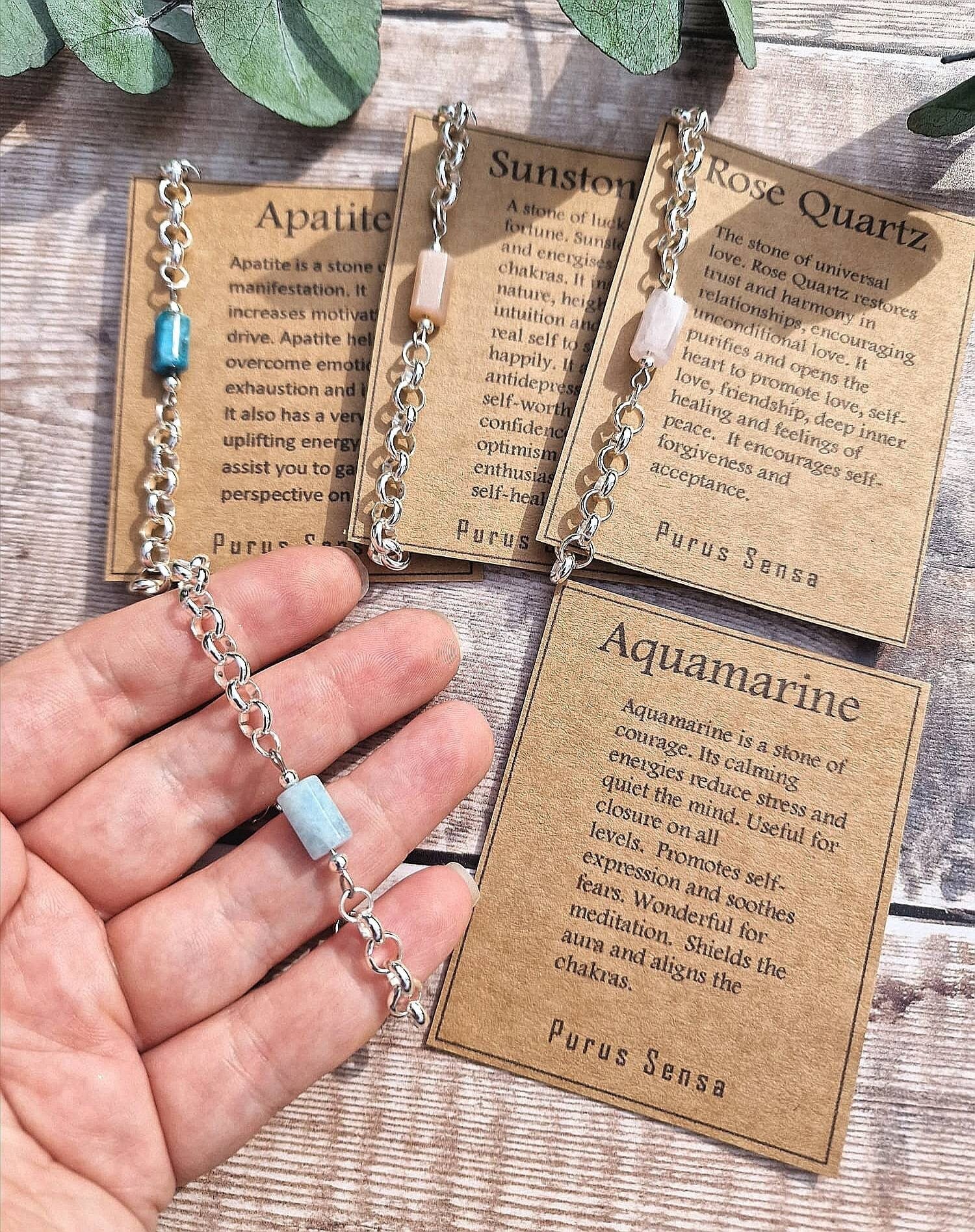 Apatite, aquamarine, Rose quartzor Sunstone chunky silver chain crystal bracelet on a descriptive Card.