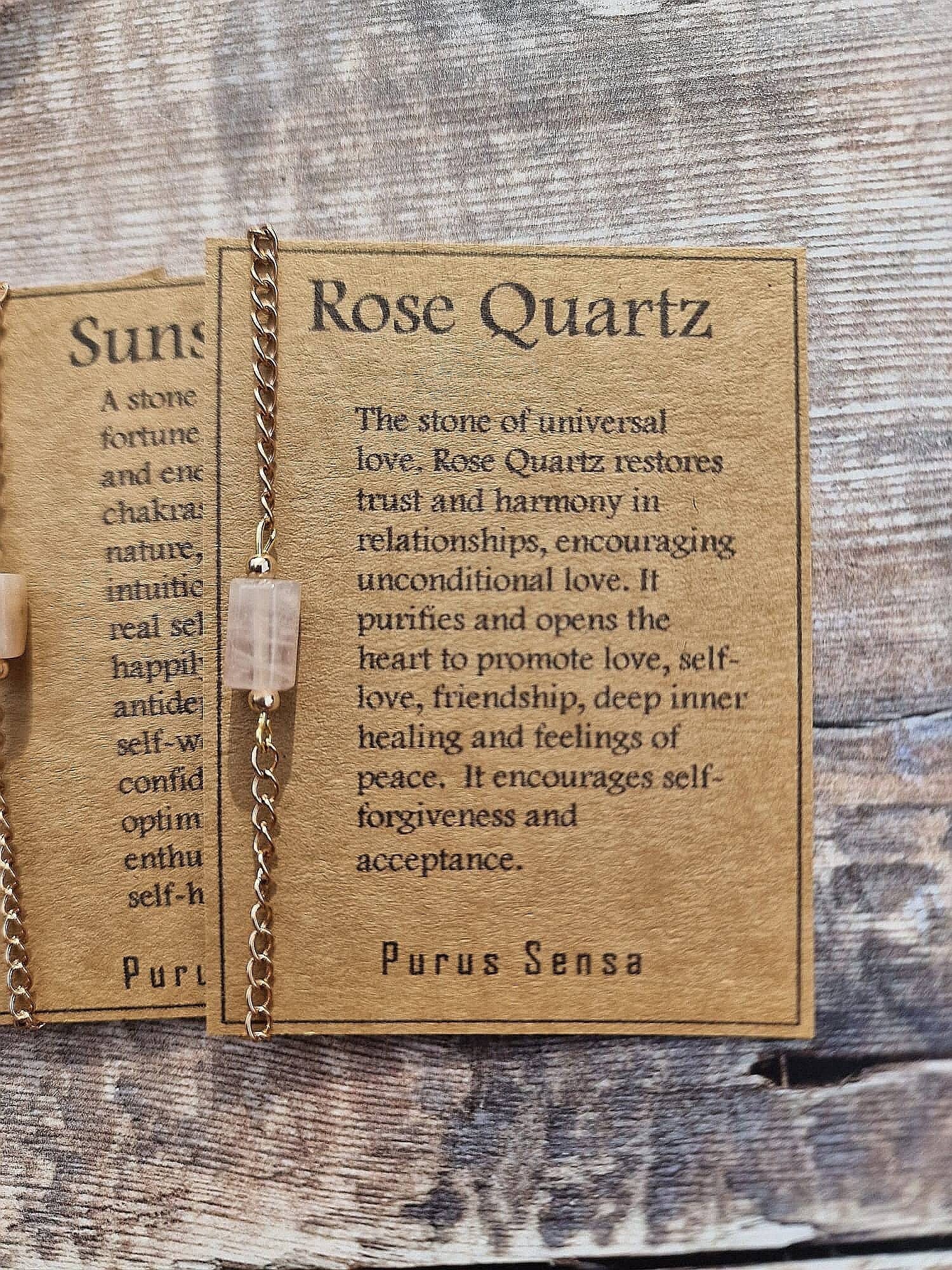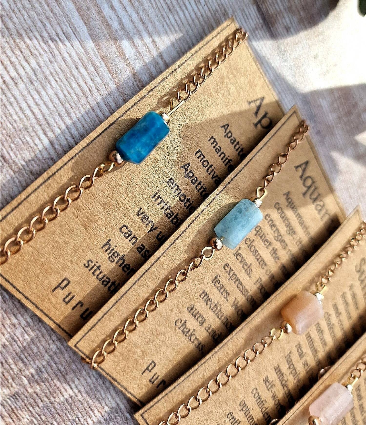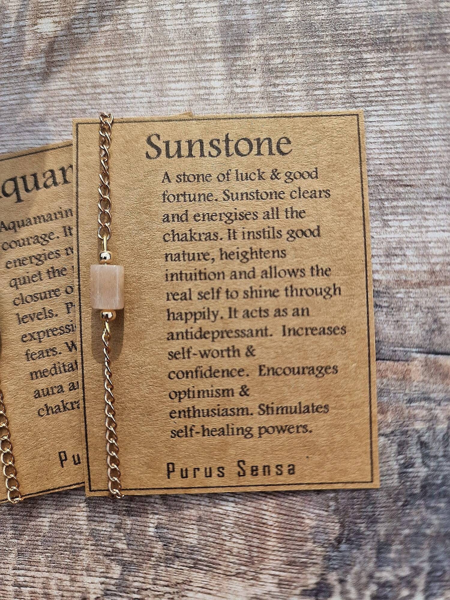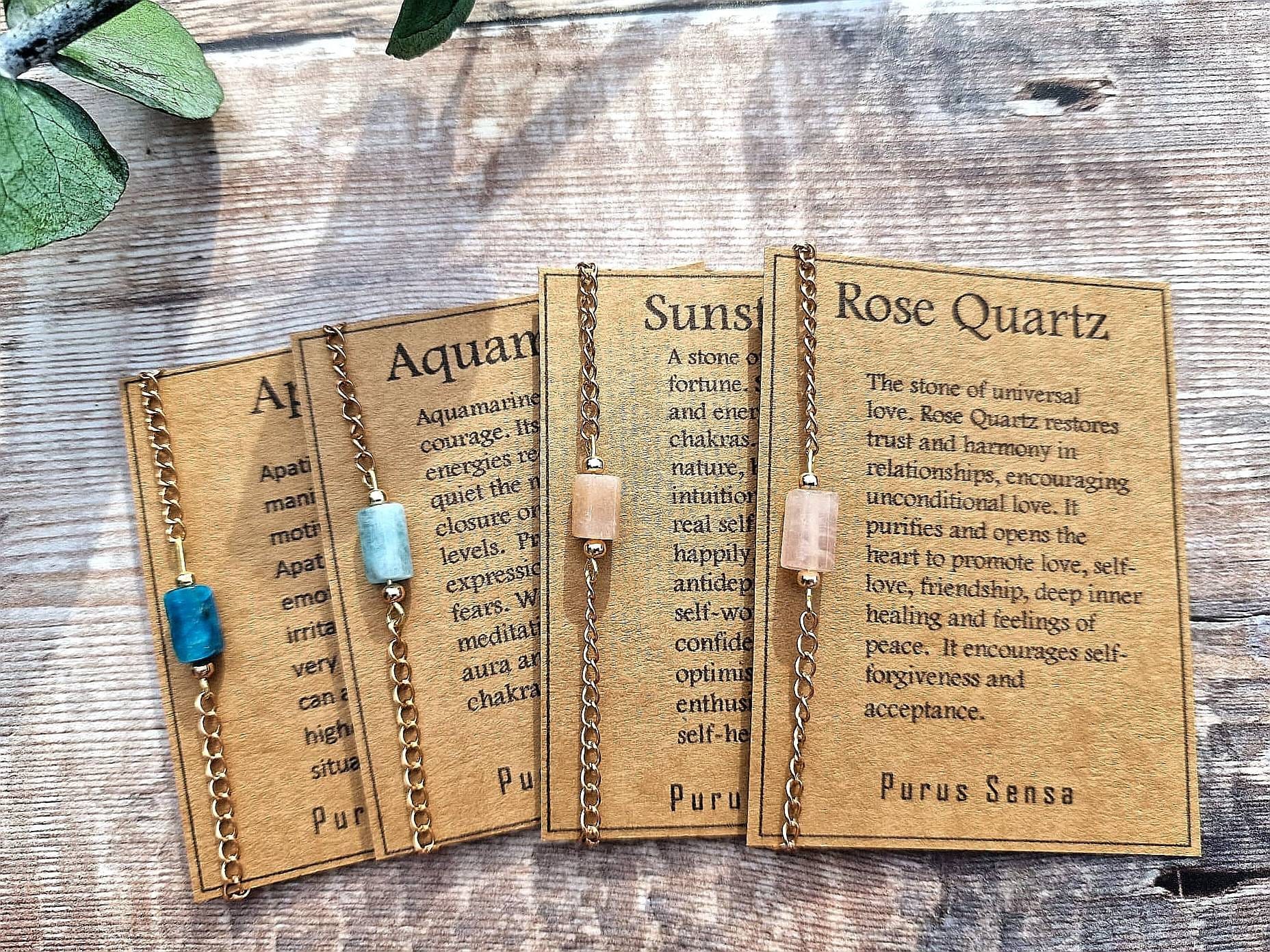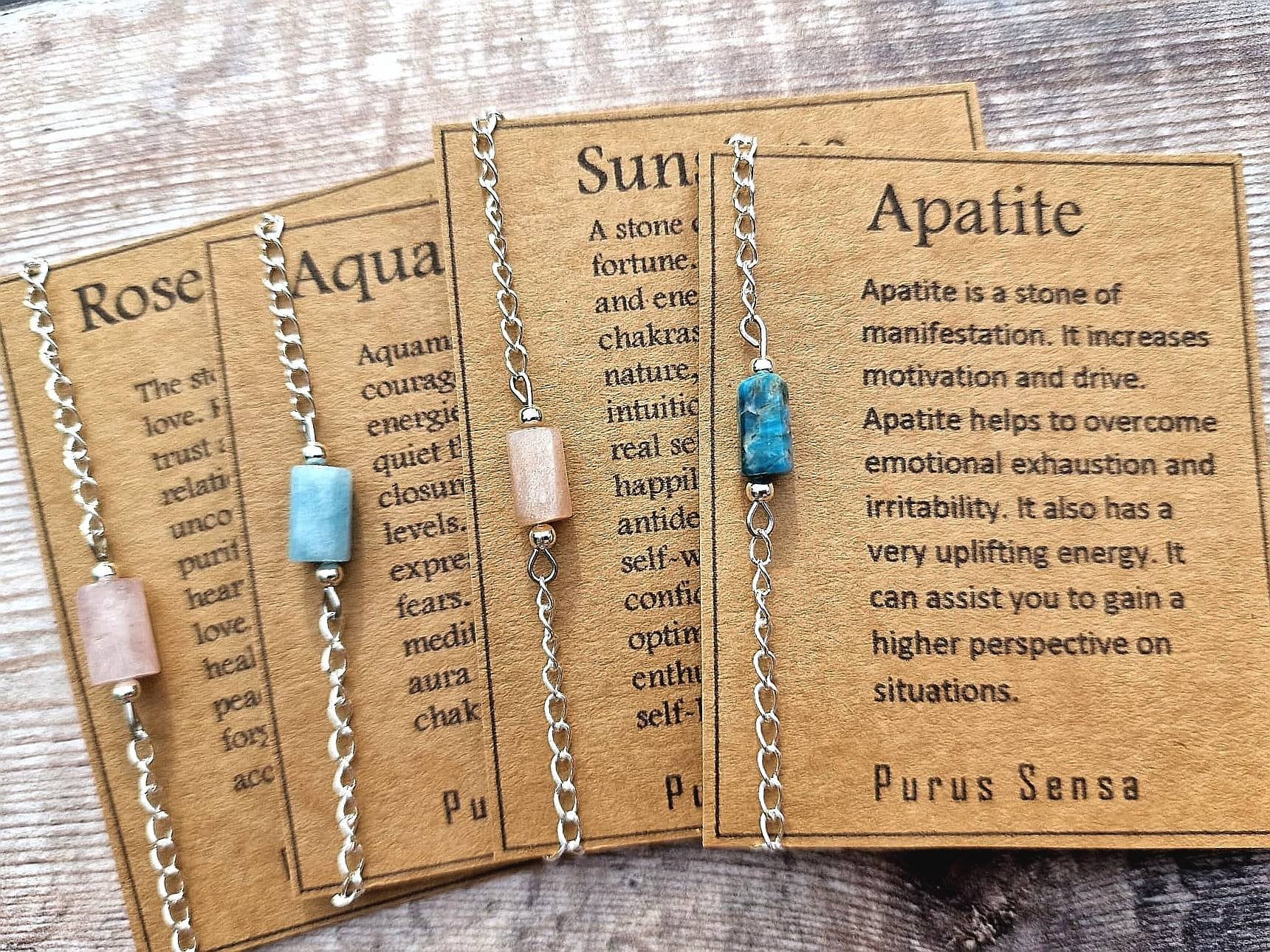 Apatite, Sunstone, rose quartz, aquamarine crystal bracelet with Rose gold or silver chain on Descriptive Card.