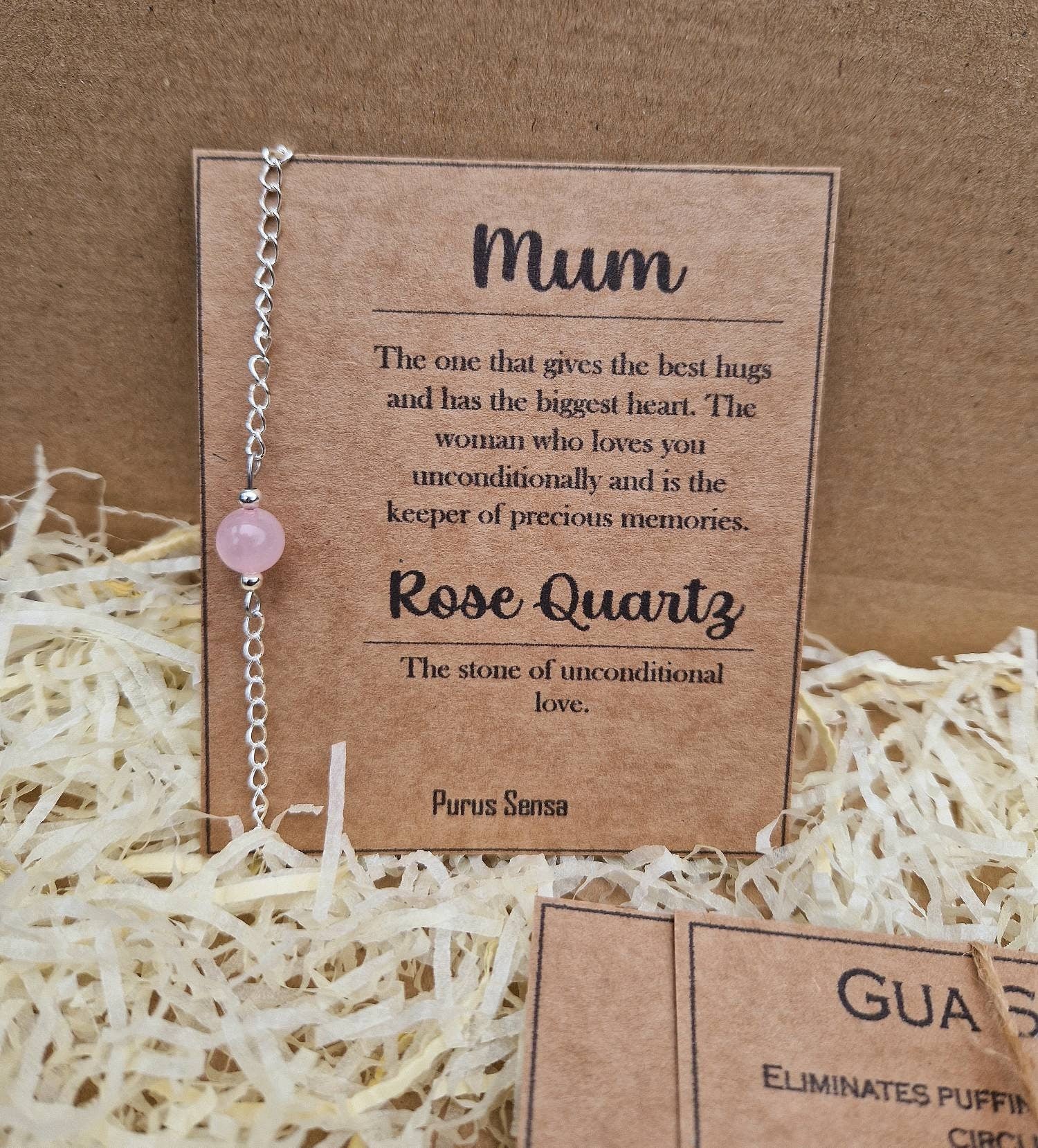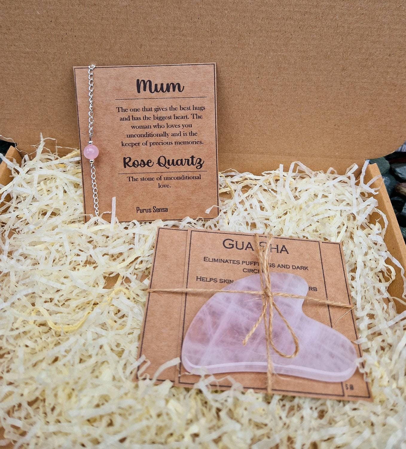 Crystal gift for mum. Mothers day crystals. Birthday gift for mum. Crystal gift for mum. Rose quartz Gua sha facial. Rose quartz bracelet.