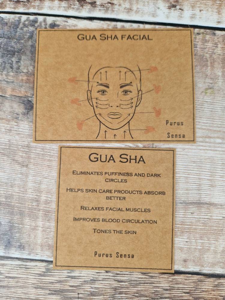 💗A high quality, Rose Quartz Gua Sha facial tool with an information and instruction diagram card.
