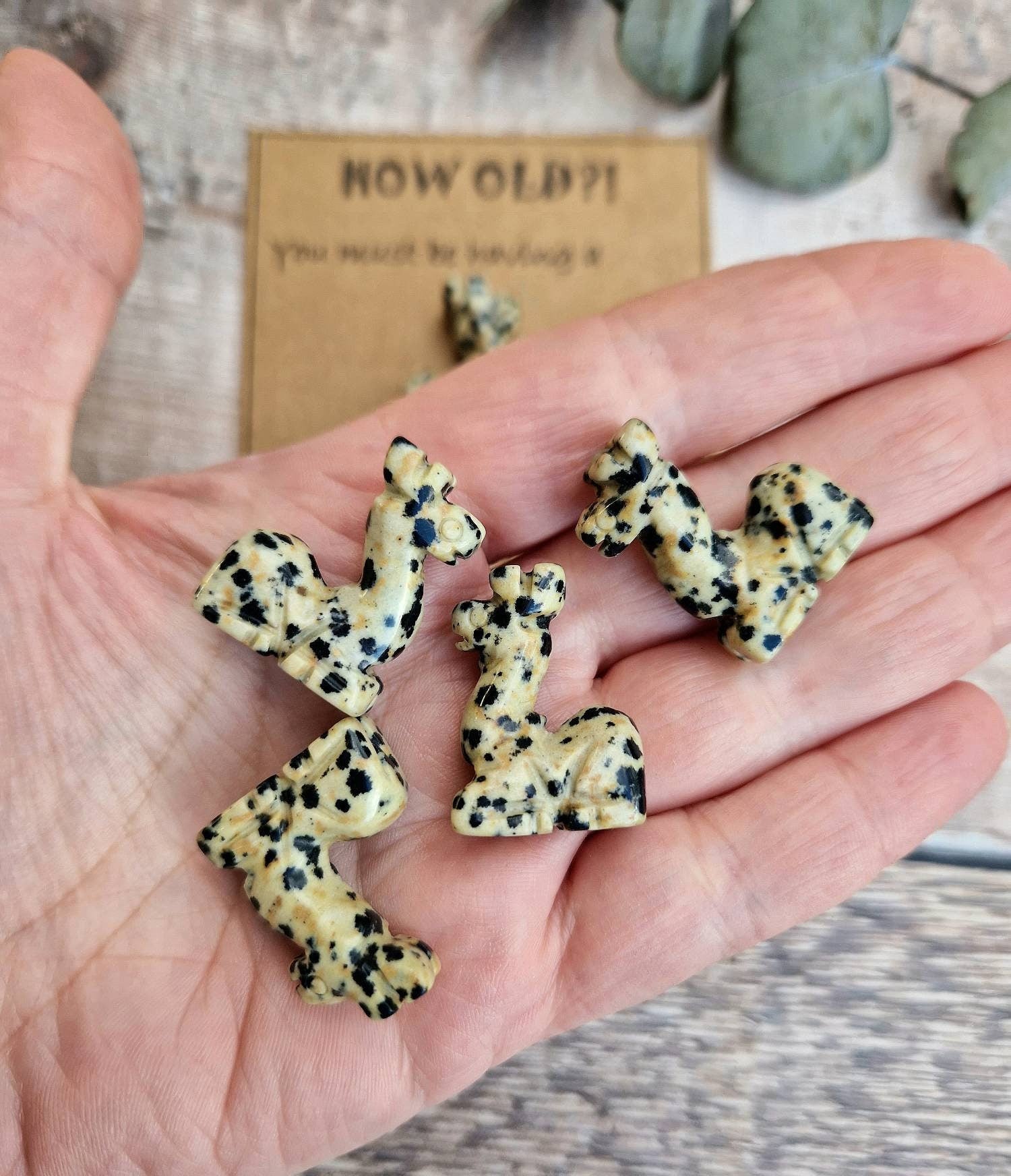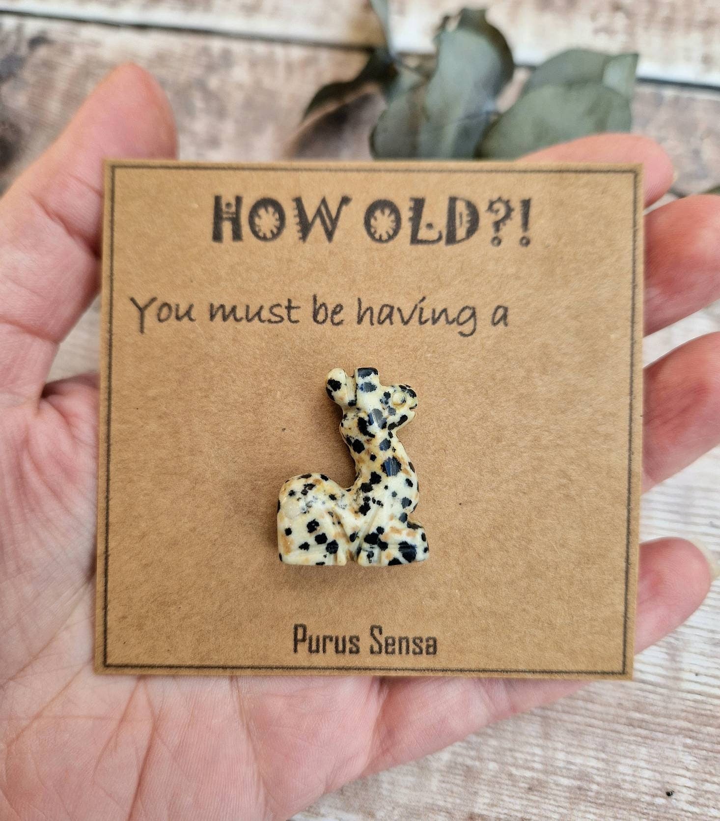This is a unique laugh out loud birthday 🦒 the giraffe is a dalmatian jasper crystal that can be removed safely from the card.
