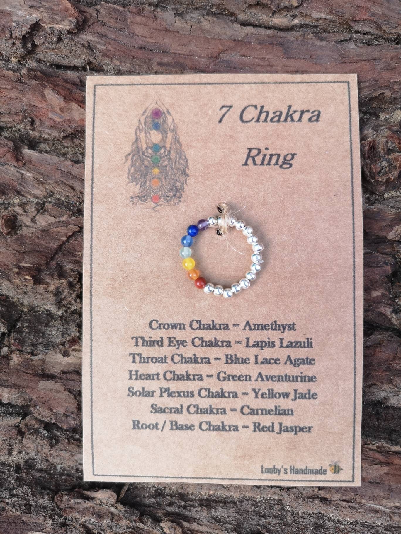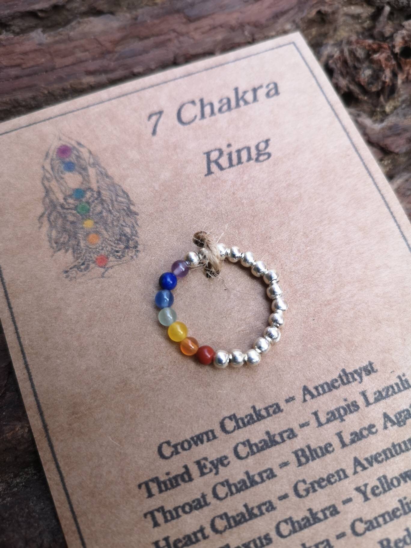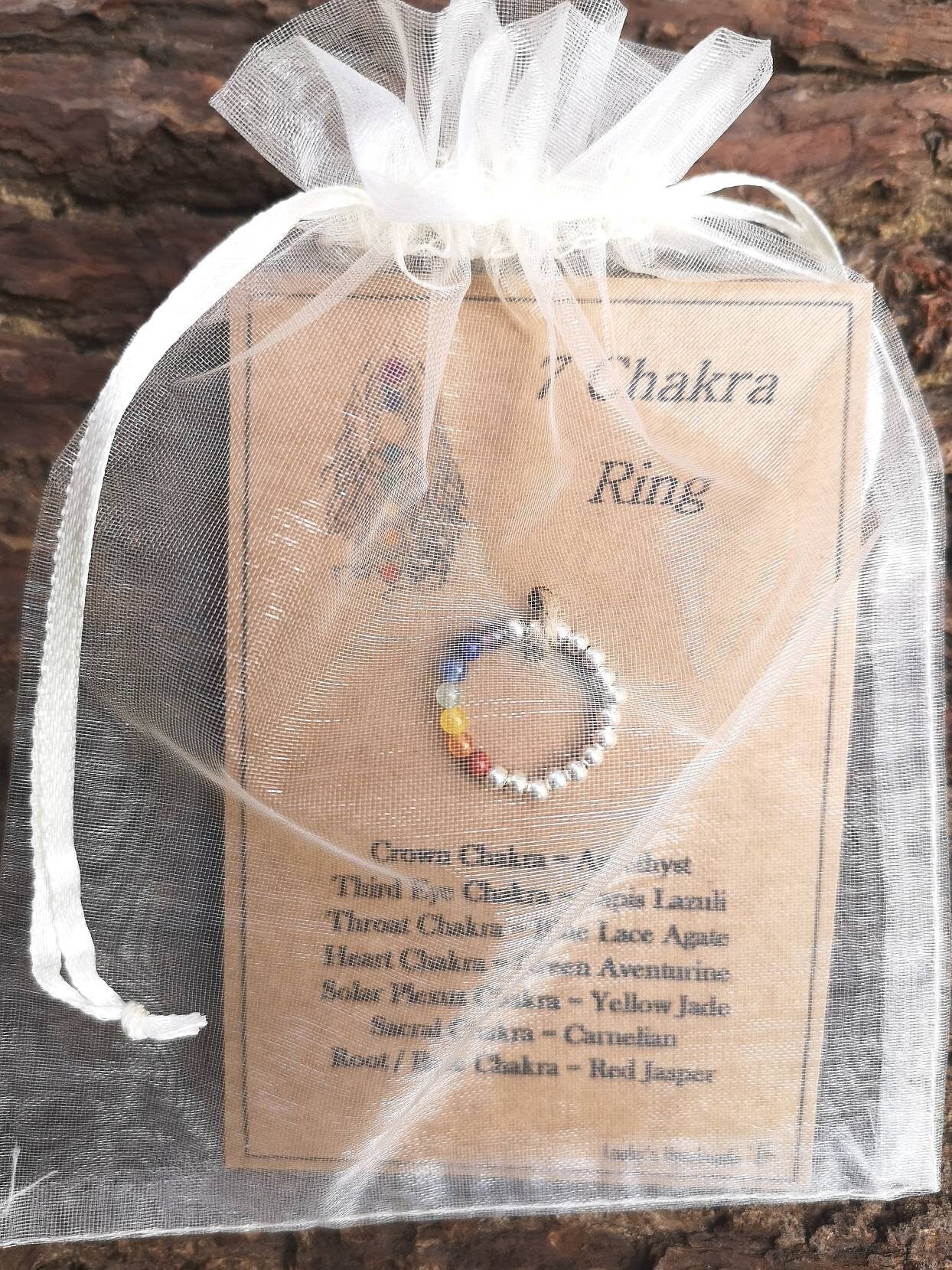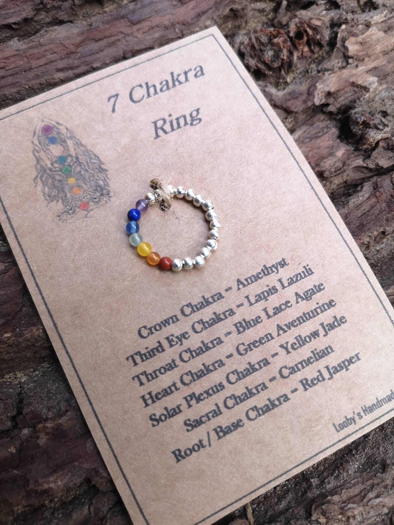 A beautiful Genuine 7 Chakra ring presented on a descriptive Recycled card.