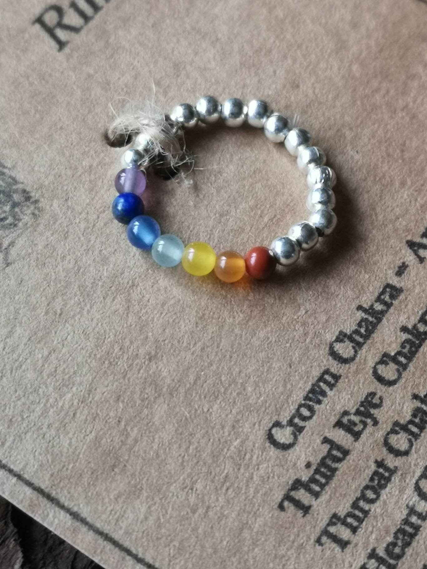 Genuine 7 Chakra Gemstone Ring Crystal Healing Ring Reiki Yoga stretch ring with silver beads on recycled card Natural