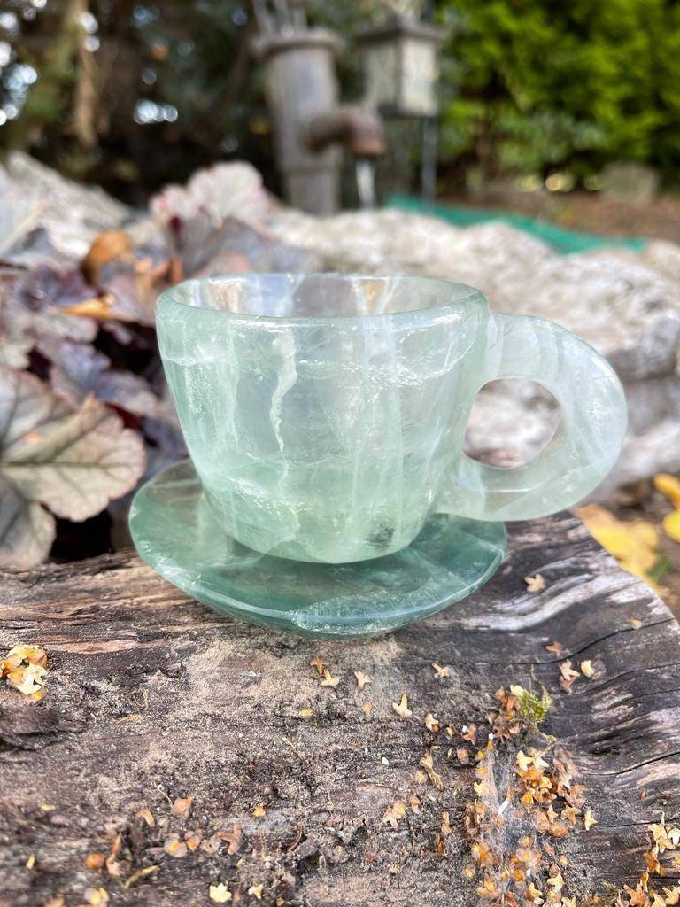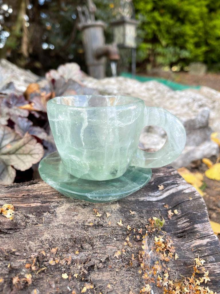 Green fluorite cup and saucer set. Premium quality. Crystal tea cup with saucer