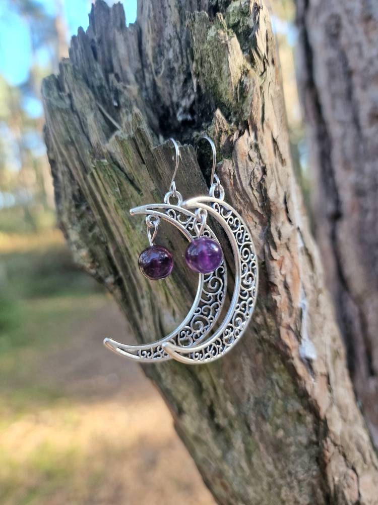 Large Amethyst and moon earrings. Hook / drop amethyst earrings. Half moon earrings