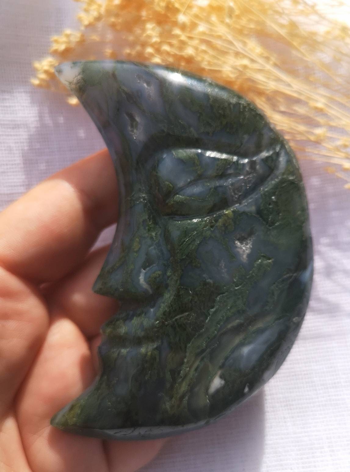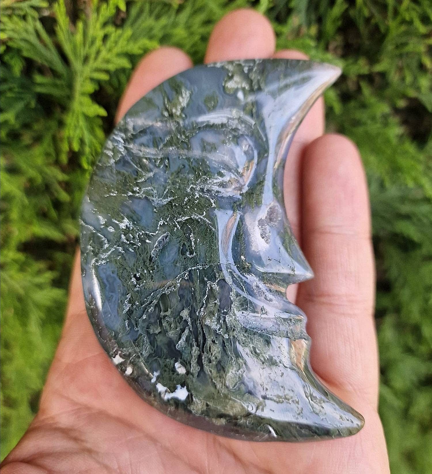 🌜A beautifully carved, large moss agate moon face. She has several druzy spots and incredible moss pattern🌛