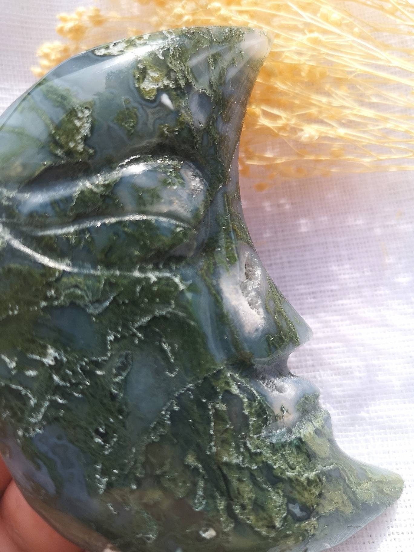 Moss agate moon. Large moss agate moon carving. Moon face with druzy.