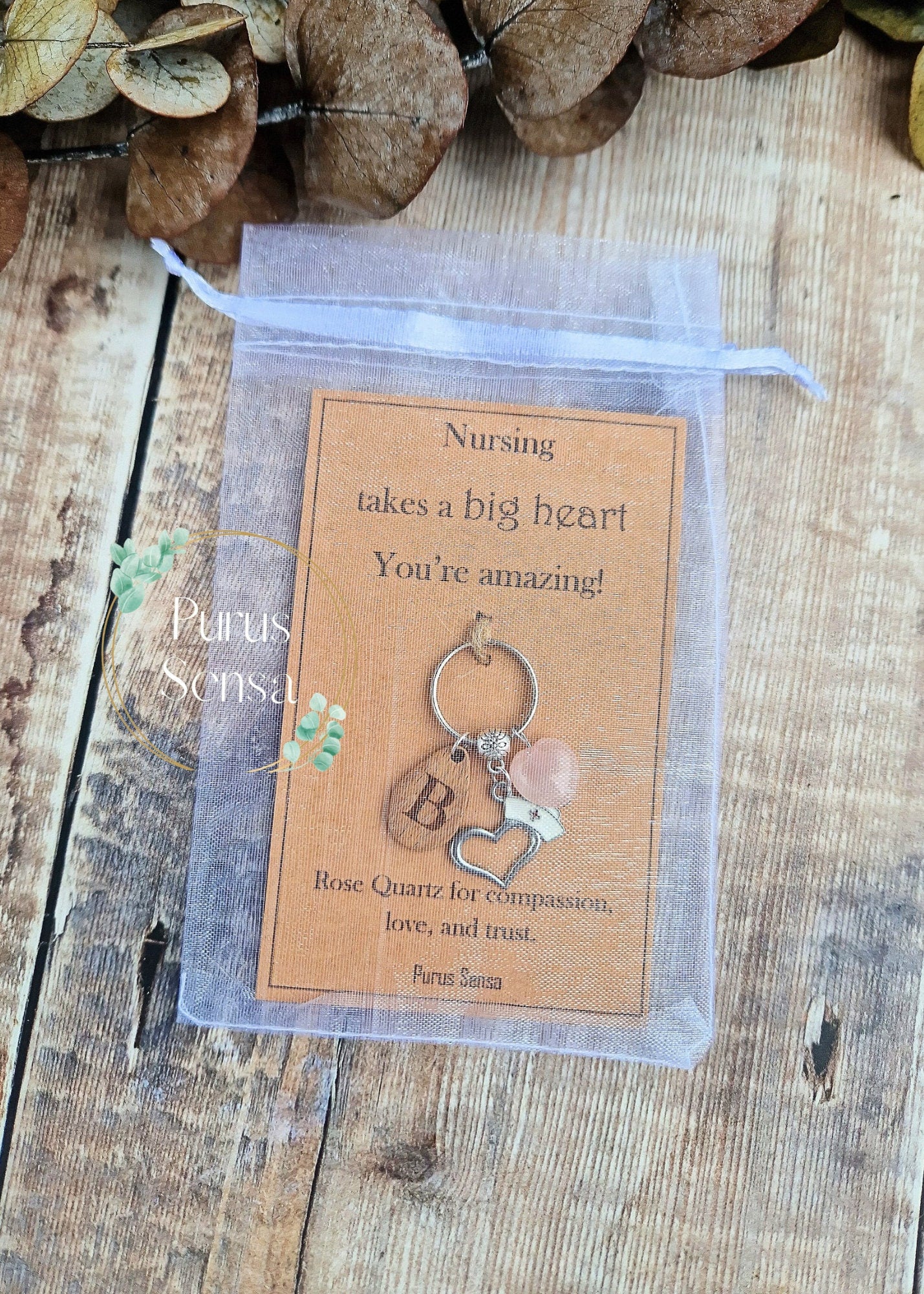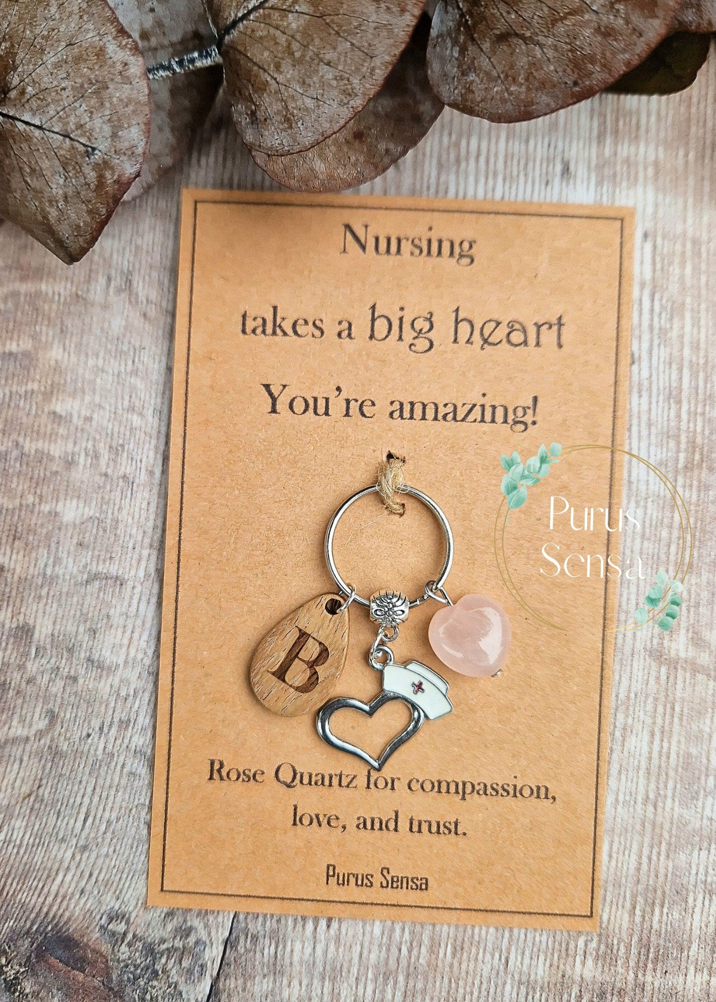 Personalised nurse gift. nurse keyring with genuine Rose Quartz crystal. Nursing gift. Thank you. Congratulations