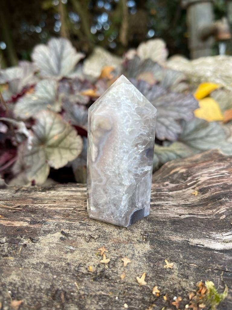 This black flower agate tower stands at 7.3cm, weighs 94g and is truelly beautiful with rainbow filled quartz and beautiful flowers all around.