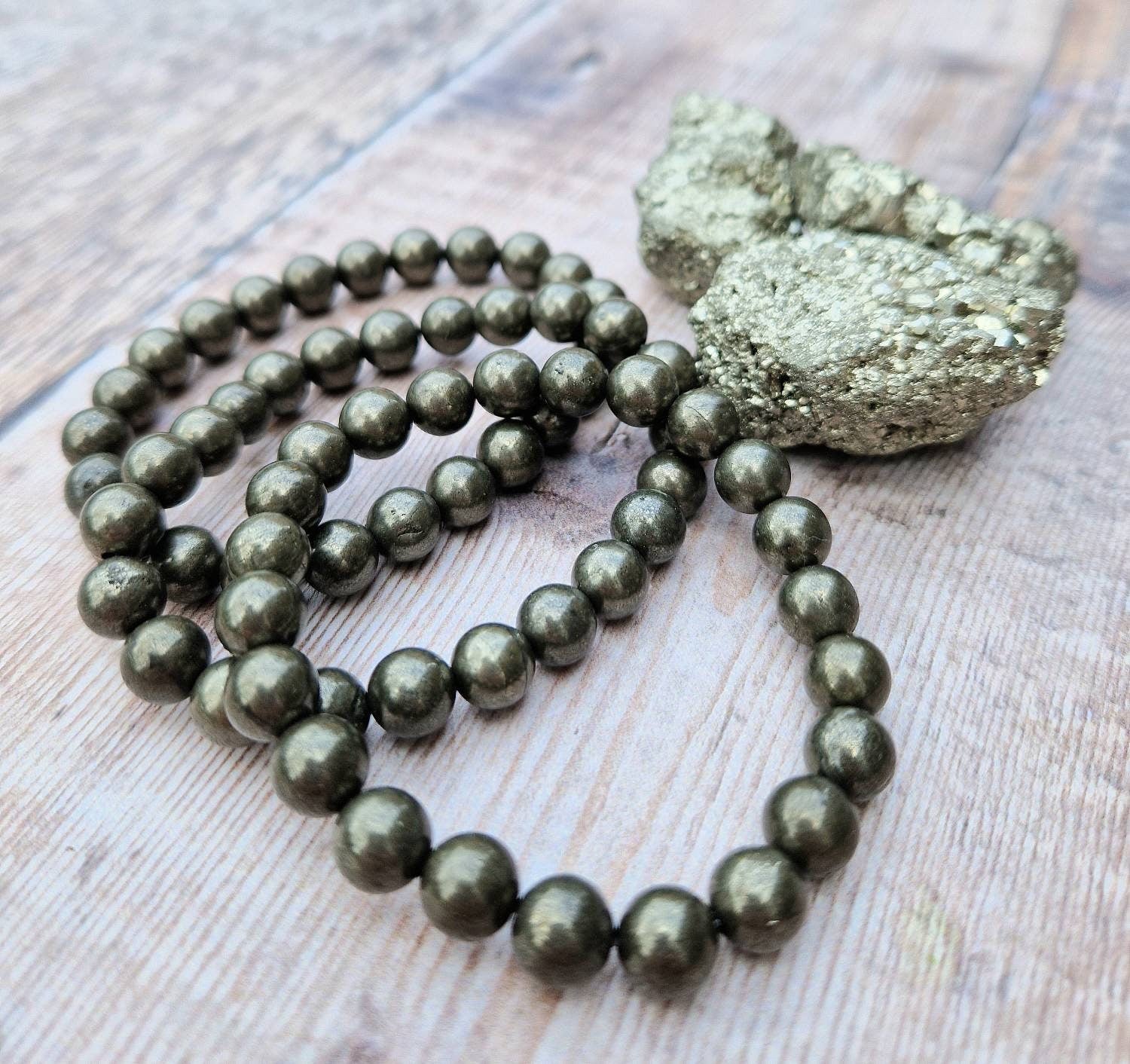 🔮Made with genuine high quality pyrite beads on strong clear elastic.