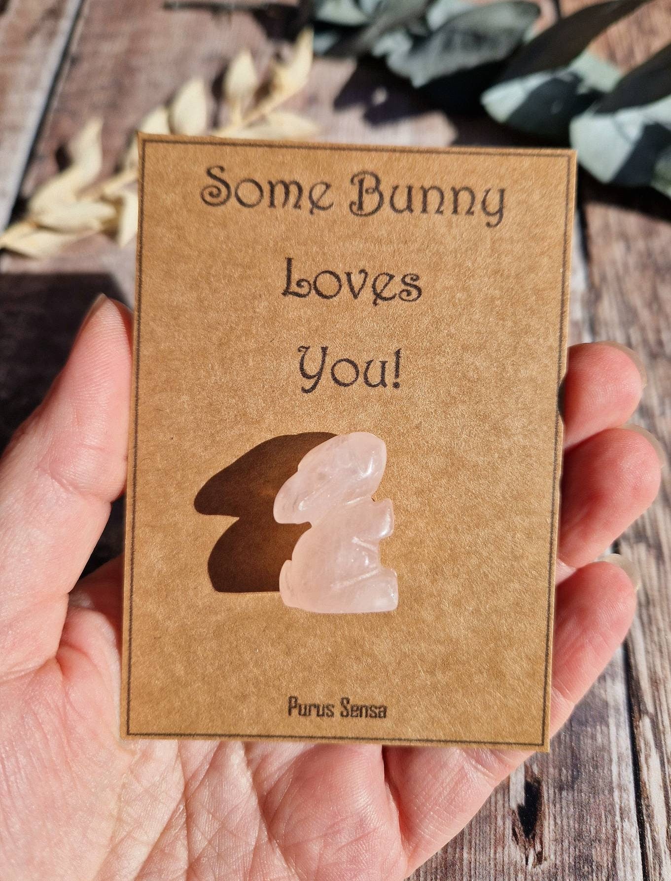 An extremely cute crystal gift including a premium quality, genuine rose quartz bunny on a gift card that reads "some bunnyloves you" 🐇