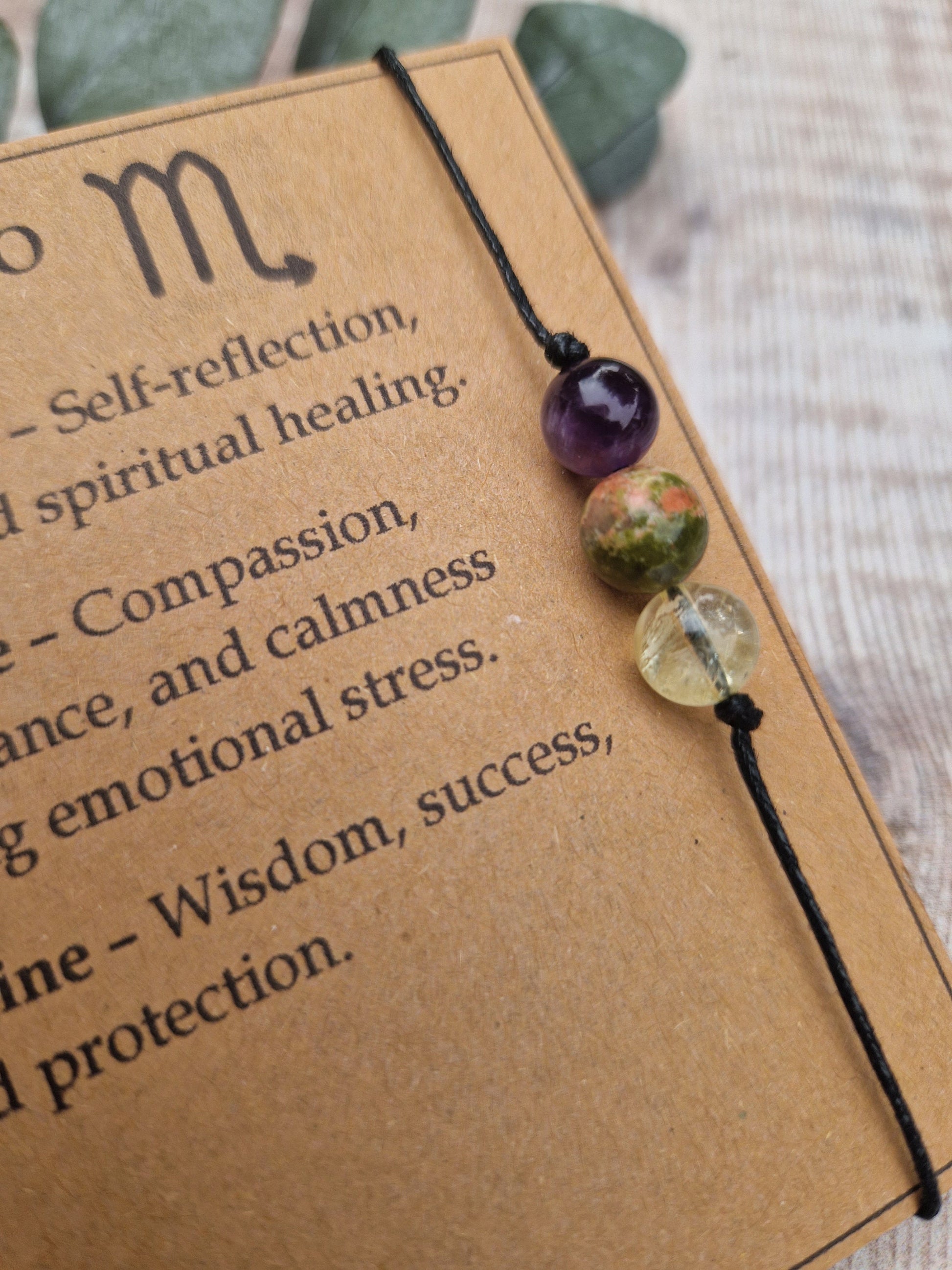 SCORPIO crystal set. Scorpio gift. Crystal gift for scorpio. Zodiac crystal set on a descriptive card. Scorpio bracelet and crystal set.