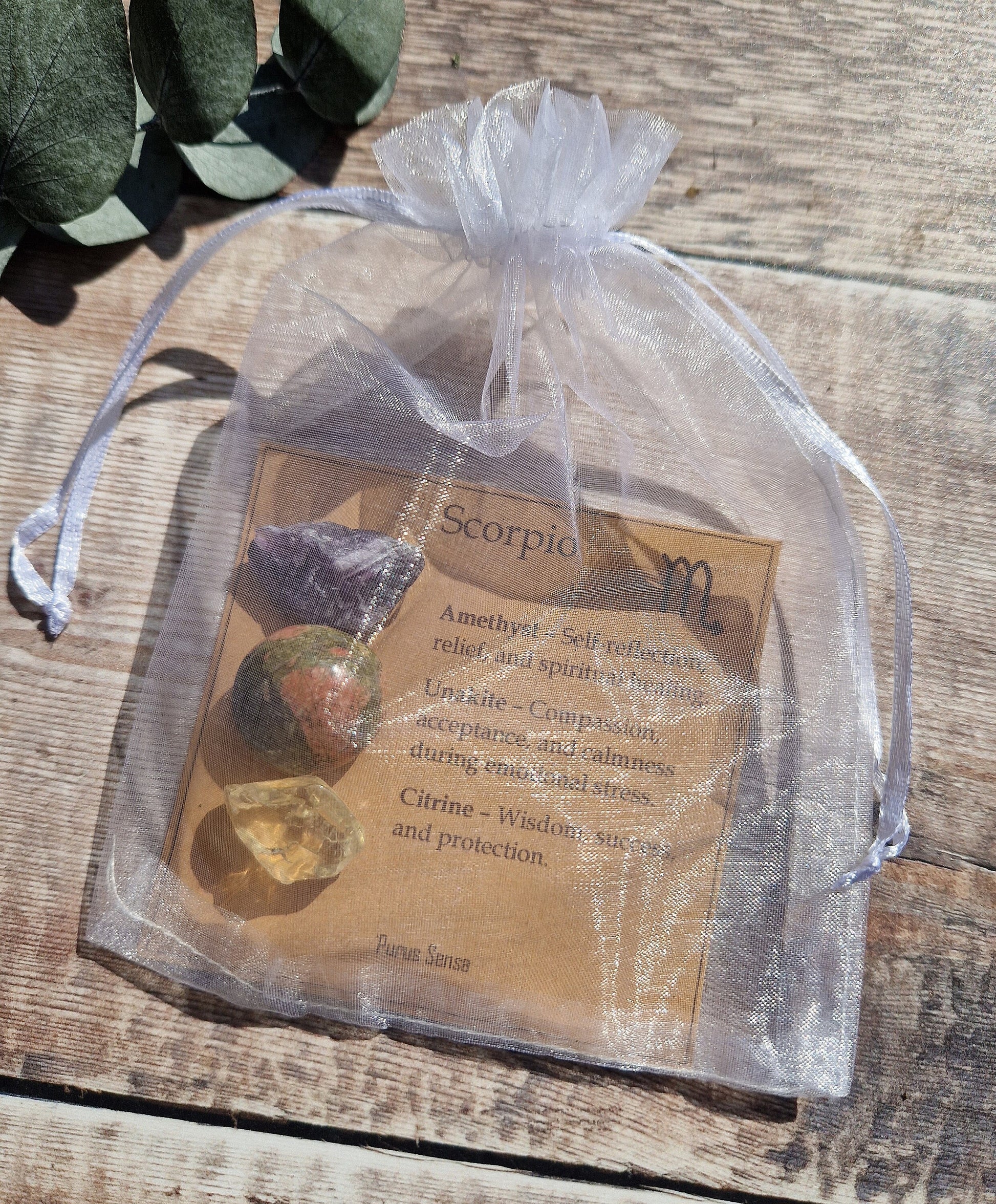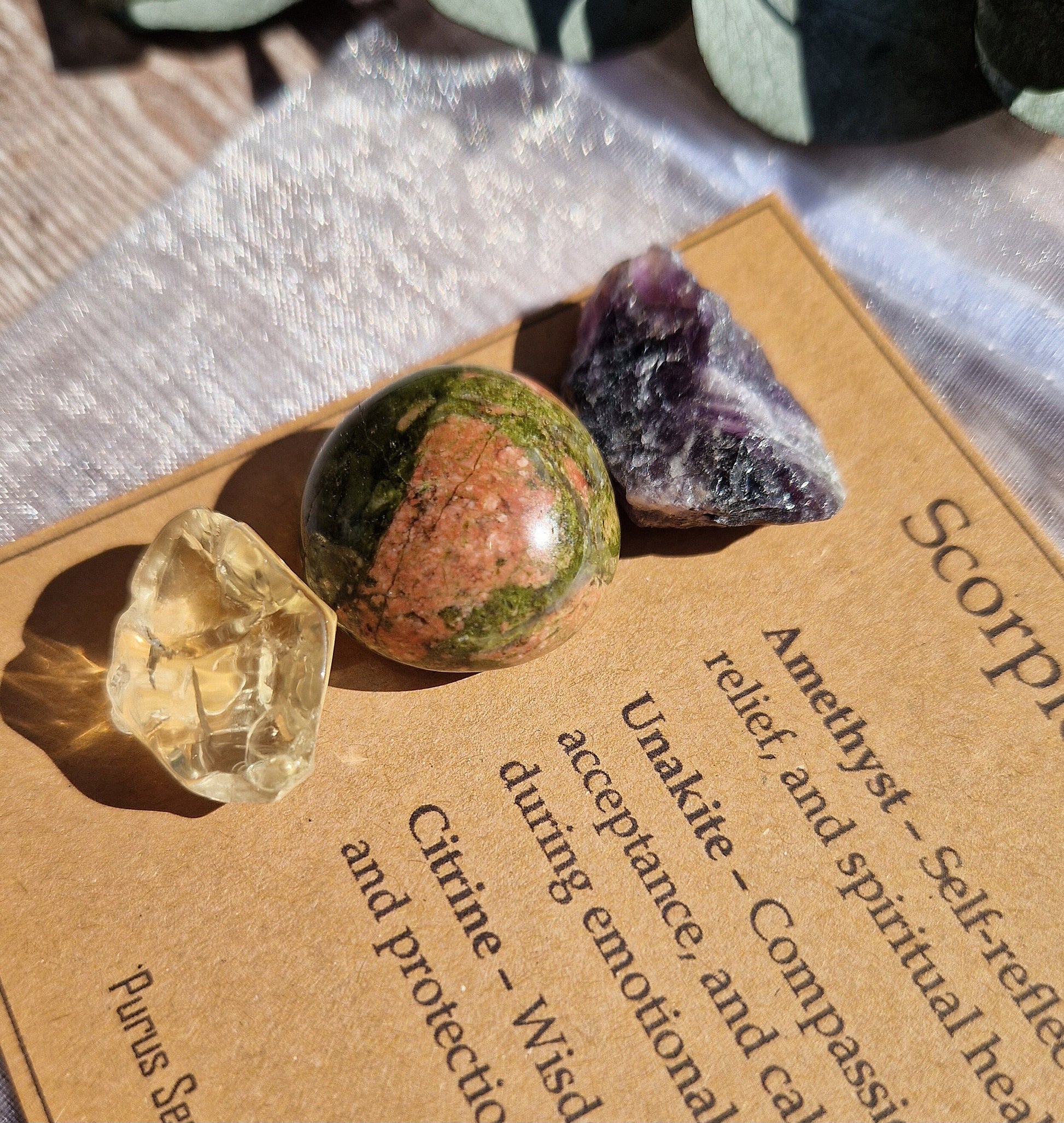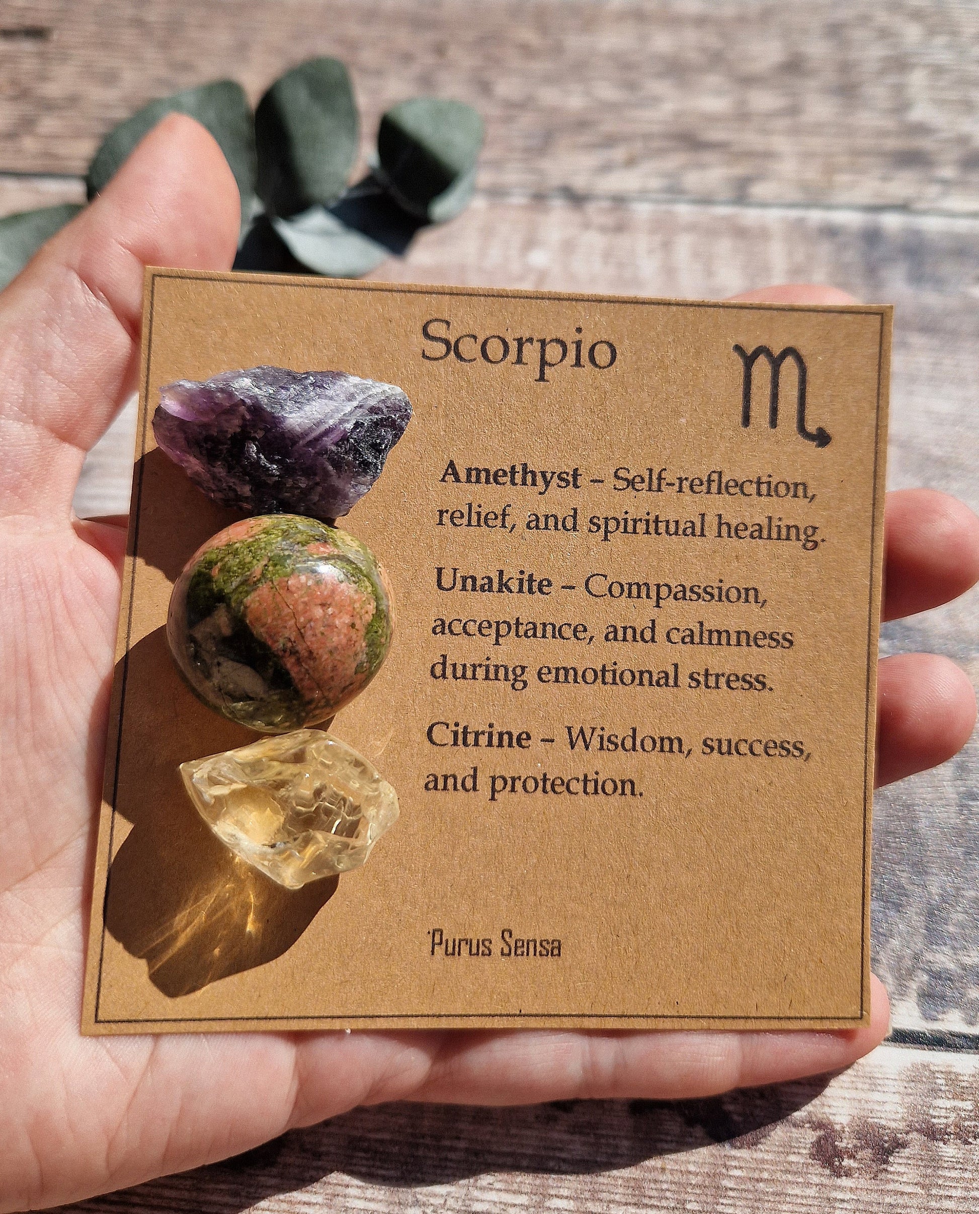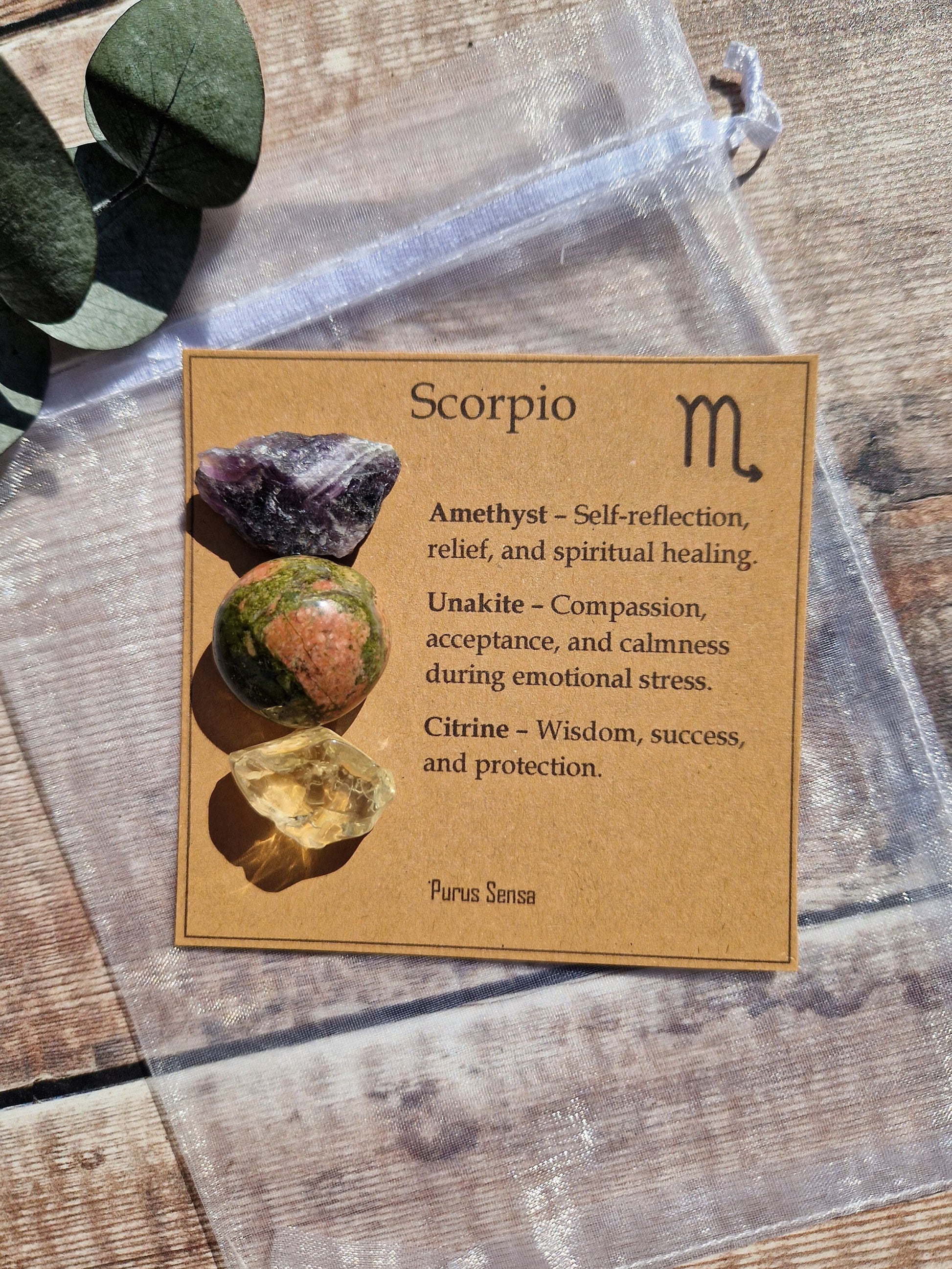 SCORPIO crystals. Scorpio gift. Crystal gift for scorpio. Zodiac crystal set on a descriptive card.
