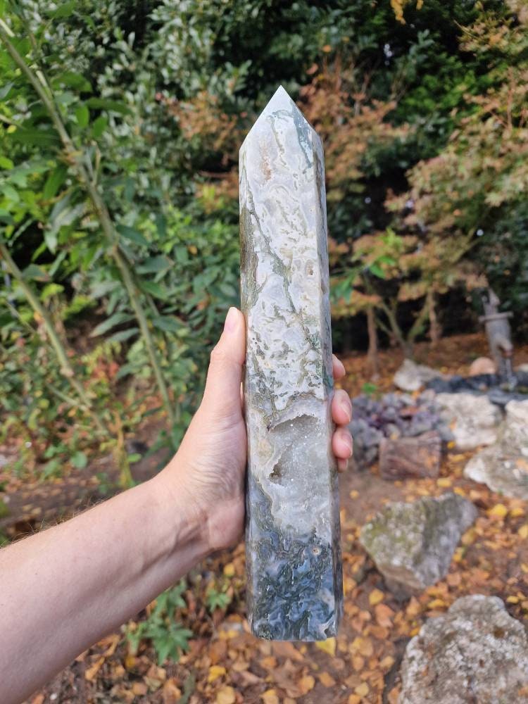 XXL moss agate tower 1430g 33cm. Beautiful moss agate statement tower. Blue moss agate with druzy 1430g